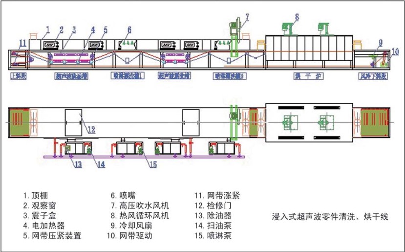 由機(jī)架、頂棚、超聲波除油槽、噴淋漂洗槽1、超聲波漂洗槽、噴淋漂洗槽2、循環(huán)副槽及過(guò)濾系統(tǒng)、油水分離系統(tǒng)、高壓風(fēng)機(jī)吹水系統(tǒng)、烘干爐、風(fēng)冷系統(tǒng)、傳動(dòng)輸送系統(tǒng)、工件籃、電氣控制系統(tǒng)等組成。